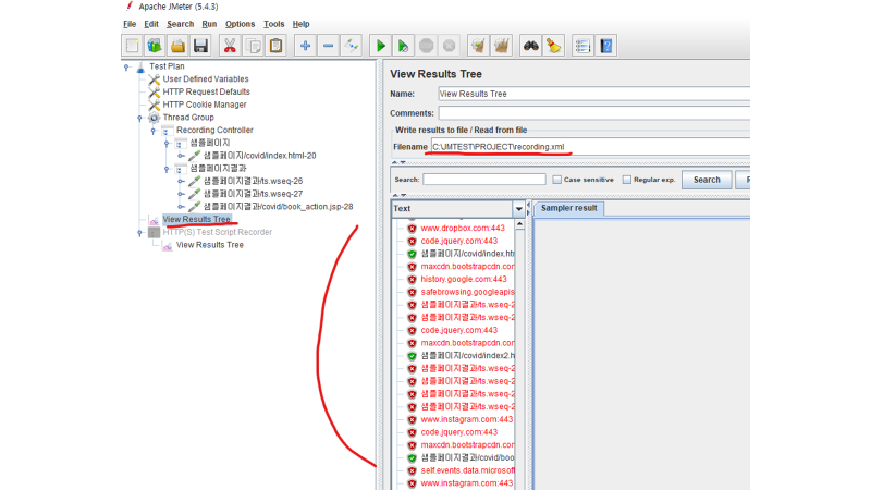 그러면 실제로 레코딩을 진행할 때 어떤식으로 레코딩이 되었는지 알아보려면 ./bin/recording.xml 파일을 찾아보면 된다. 이것을 view result tree 에 넣어서 실제 레코딩 상태가 어땠는지 확인해본다.