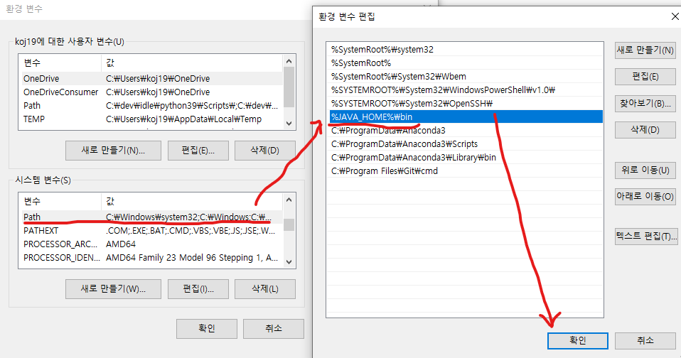 환경변수에 들어가서 환경변수와 path를 각각 변경해주면 된다